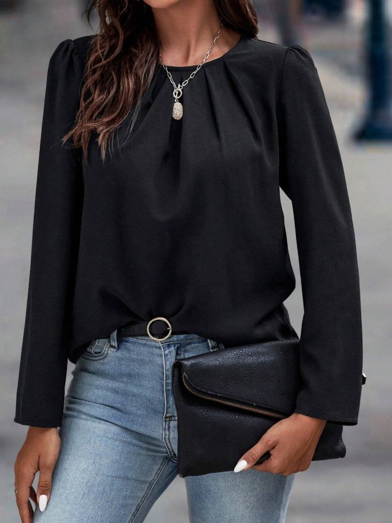 Kadın Uzun Kollu Yuvarlak önden Pileli Ithal Krep Bluz