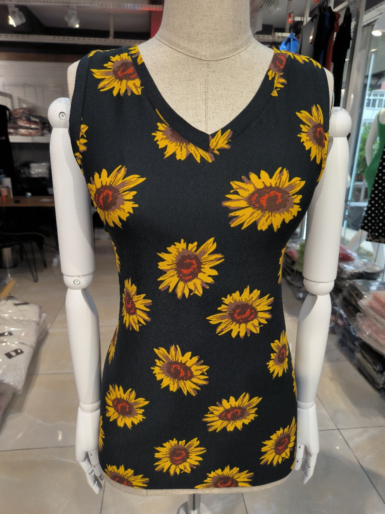 Kadın V Yaka Kolsuz Ayçiçeği Desen Krep Bluz