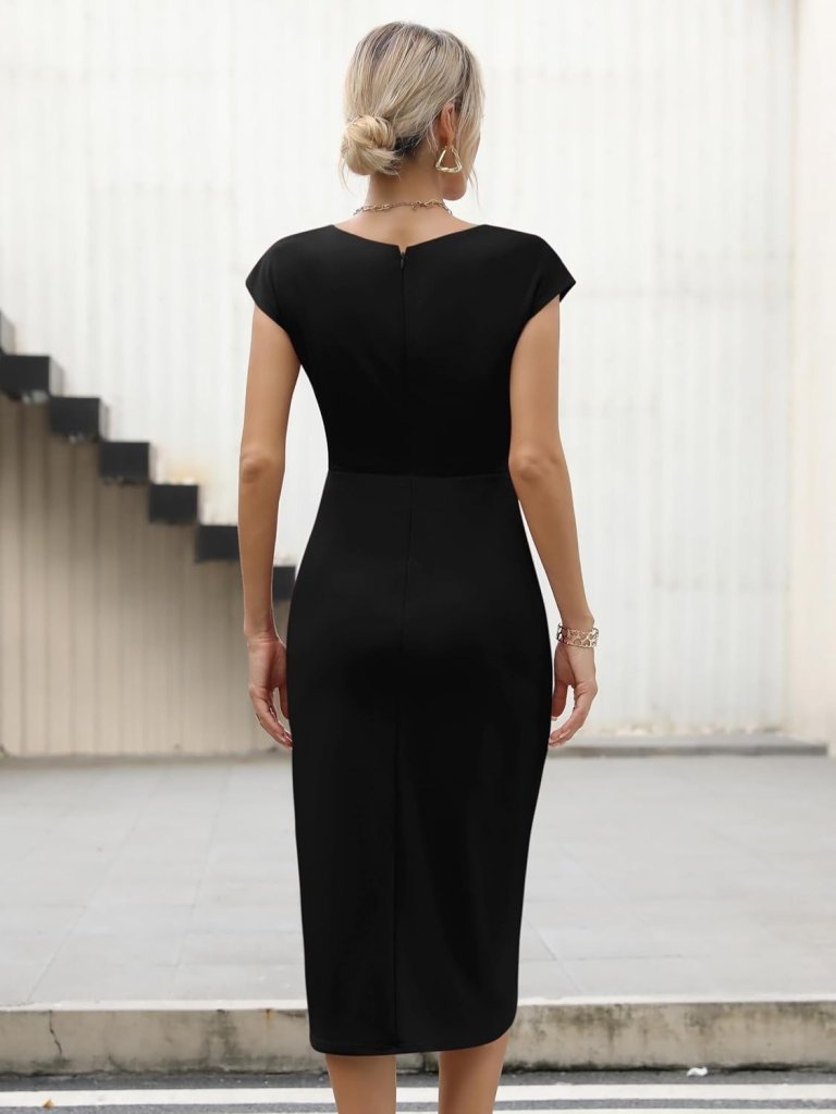 Kadın Kısa Kollu Yakadan Ve Etekten Fermuarlı Midi Viskon Iki Iplik Elbise