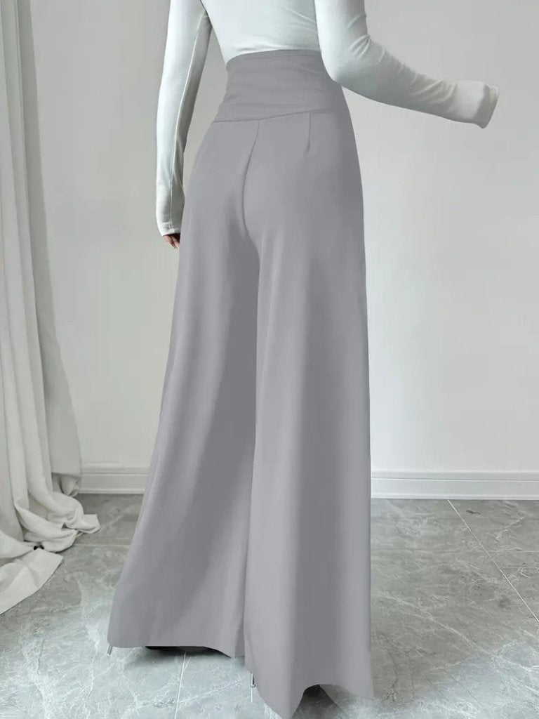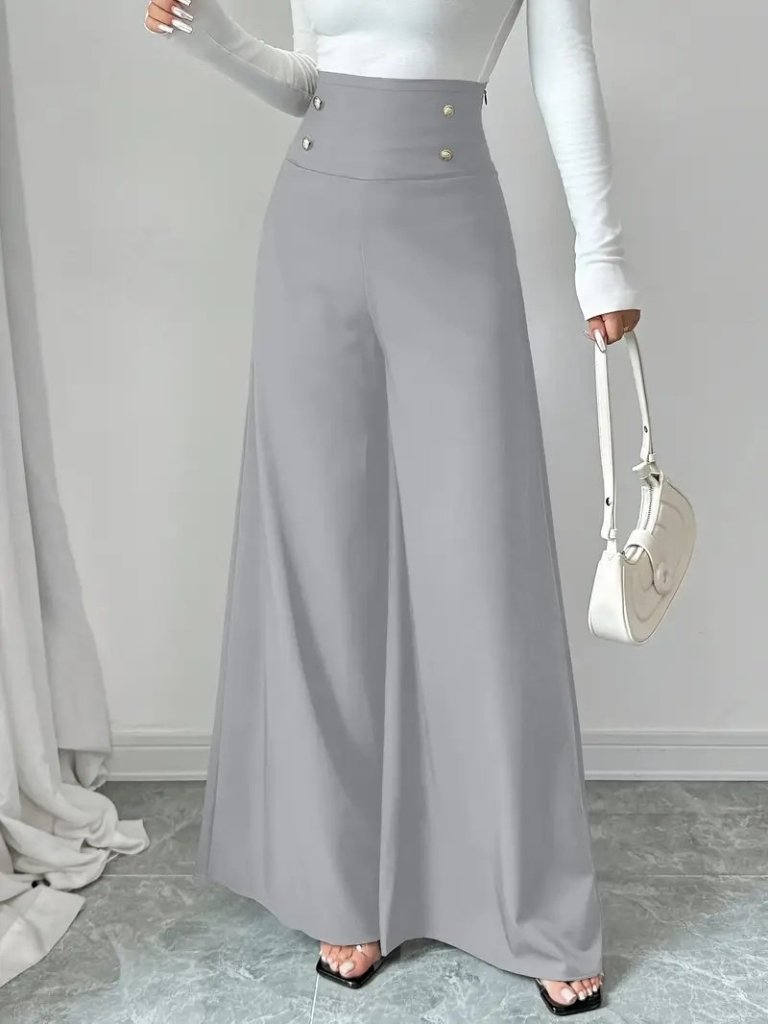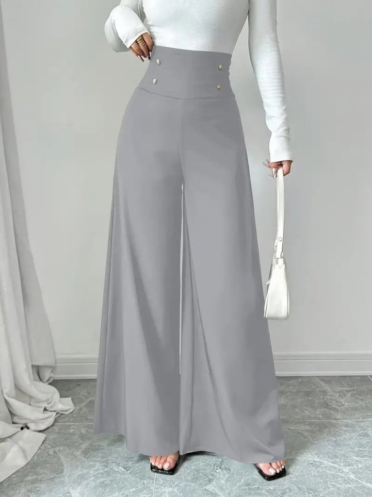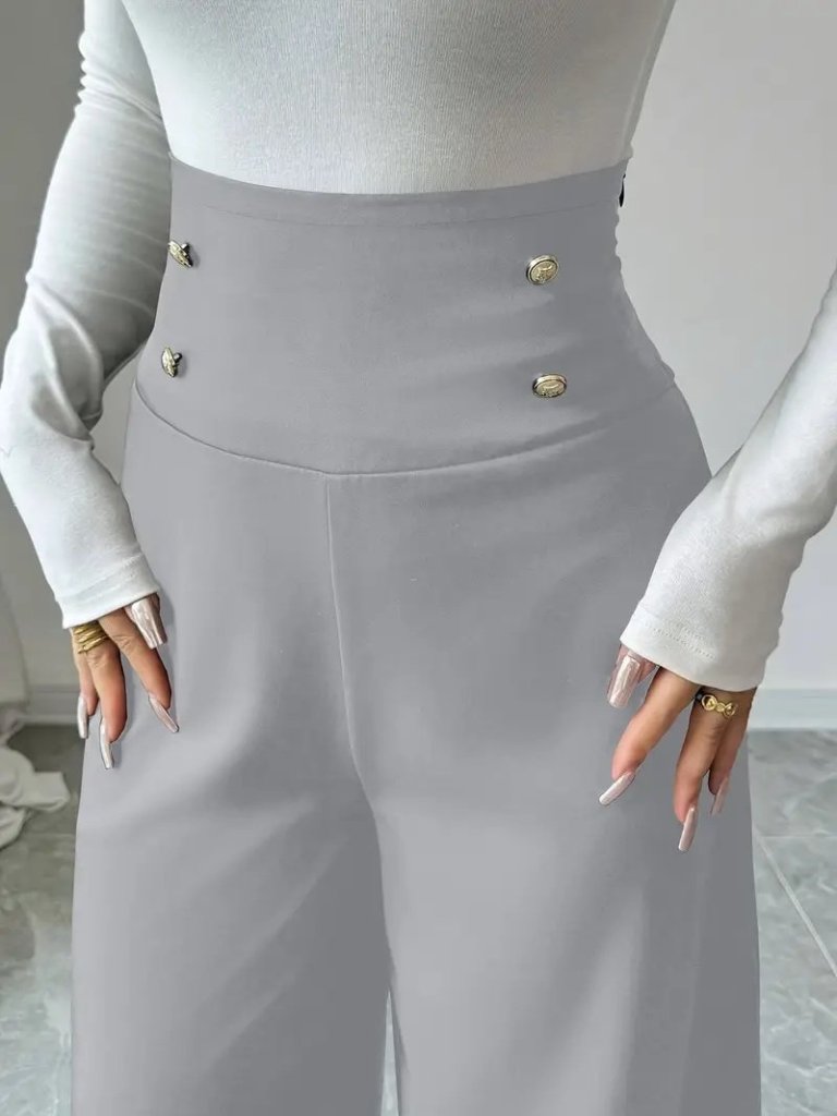 Kadın Yüksek Bel Düğmeli Geniş Paçalı Ithal Krep Pantolon