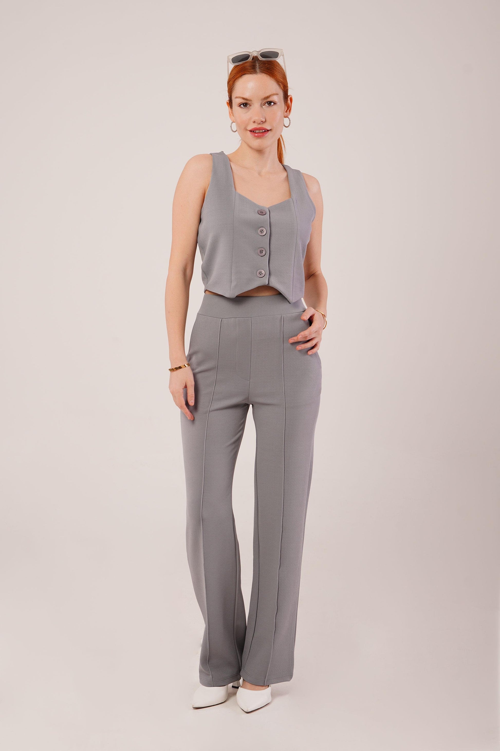 Kalın Askılı Düğmeli Yelek Ve Pantolon Gri Takım