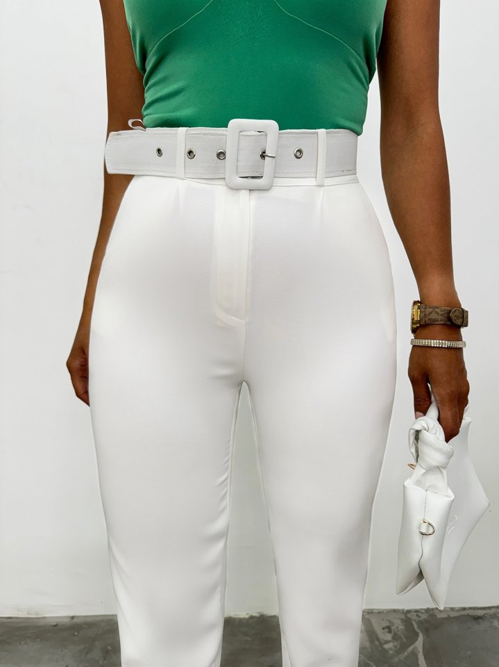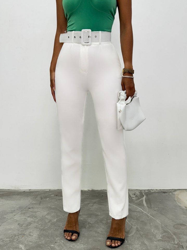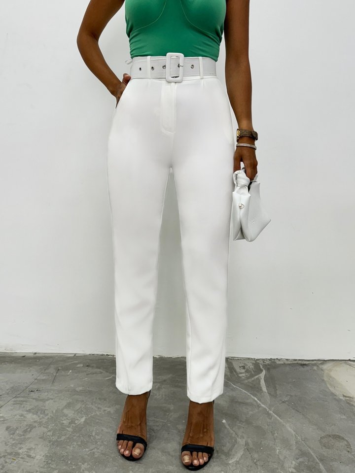 Kalın Kemerli Kumaş Pantalon -Ekru