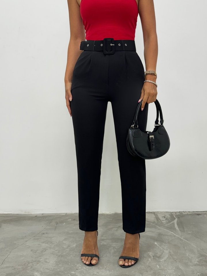 Kalın Kemerli Kumaş Pantalon -Siyah