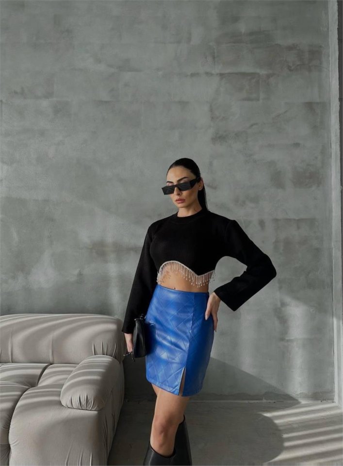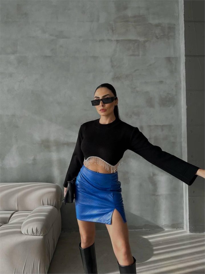 KAPİTONE DERİ ETEK YIRTMAÇLI - Saks