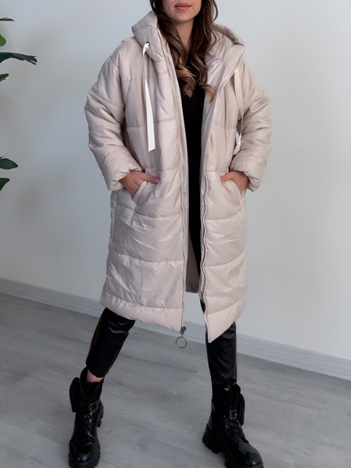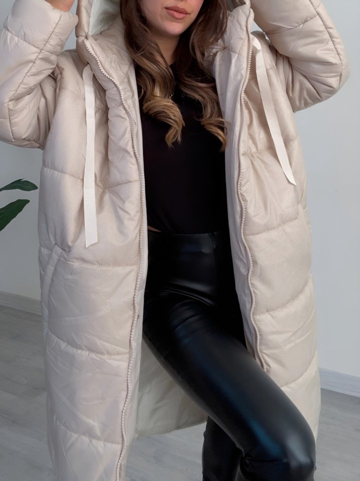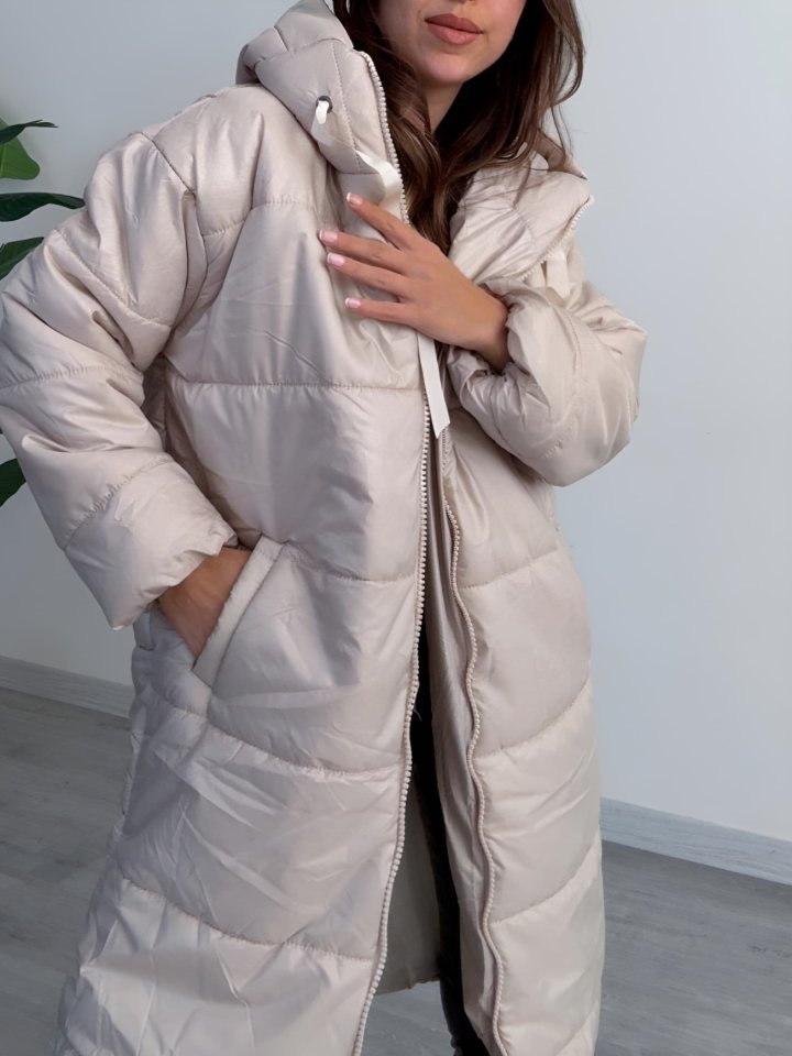Kapşonlu Bağcık Detaylı Fermuarlı Şişme Mont -Ekru