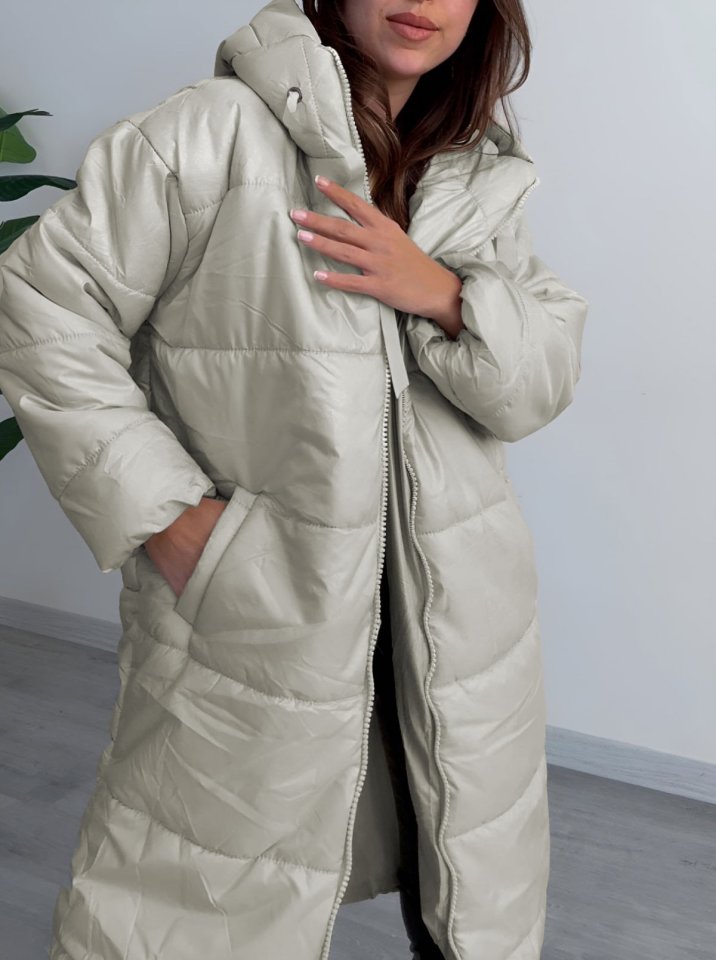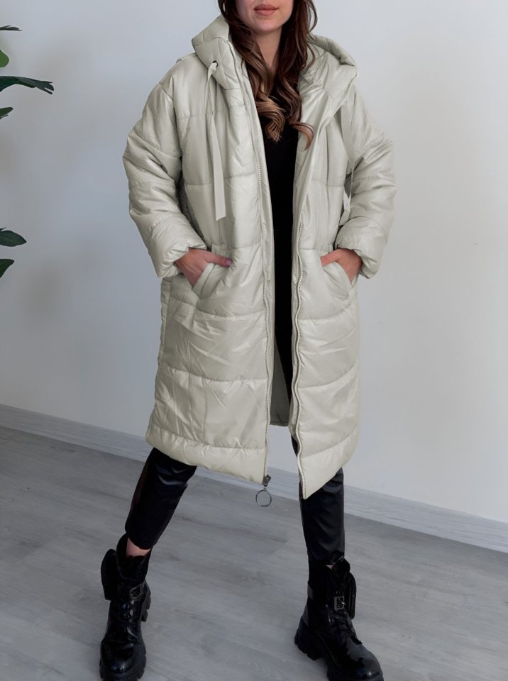 Kapşonlu Bağcık Detaylı Fermuarlı Şişme Mont -Taş