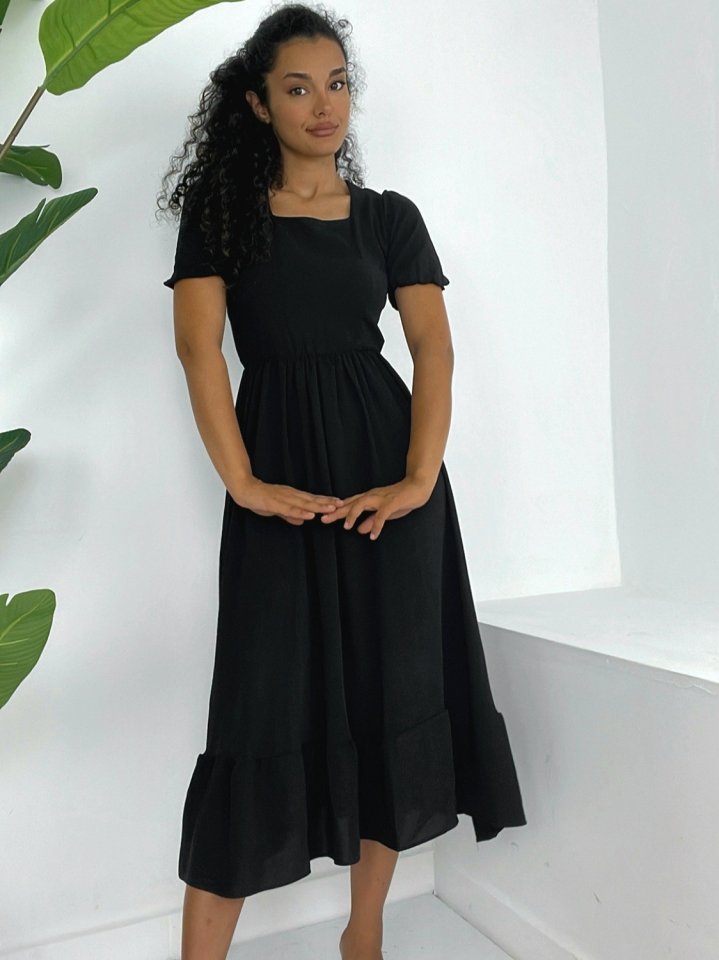 Kare Yaka Beli Lastikli Kısa Kol Ayrobin Elbise -Siyah