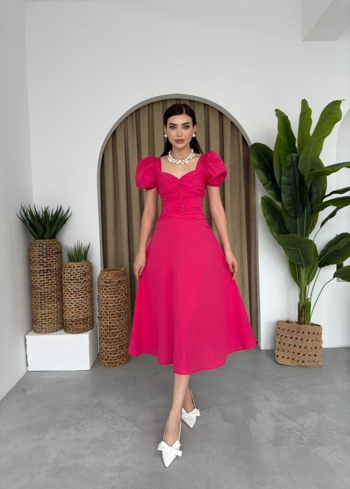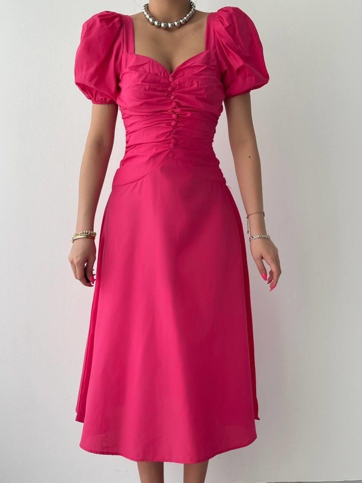 Kare Yaka Düğmeli Elbise