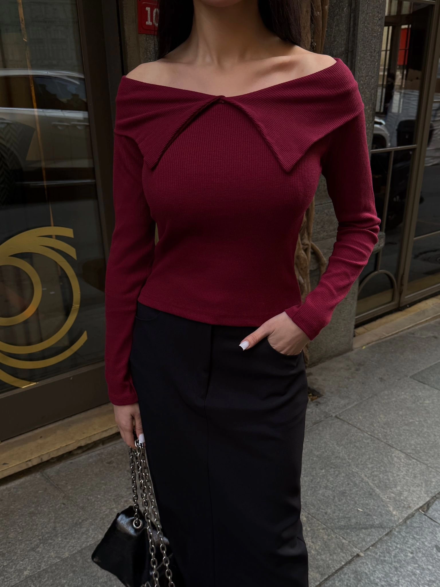 Kelebek yaka uzun kol bluz bordo