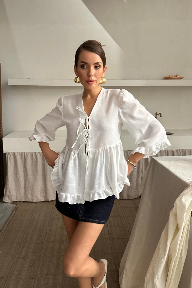 KETEN BLUZ ÖNDEN BAĞLAMALI FIRFIR DETAYLI - Beyaz
