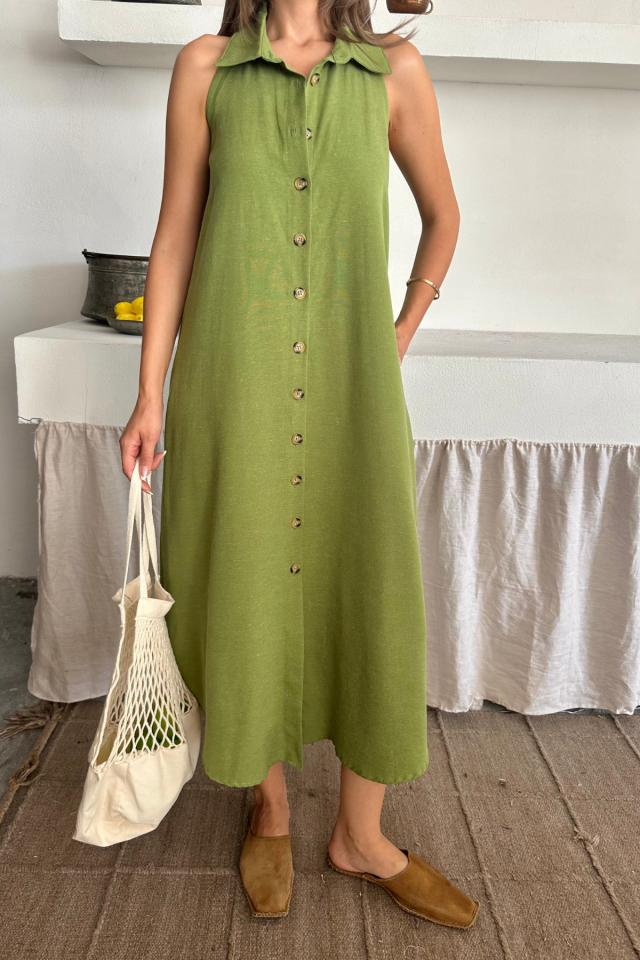 KETEN ÖNDEN DÜĞMELİ KOLSUZ GÖMLEK YAKA ELBİSE - Yağ Yeşili