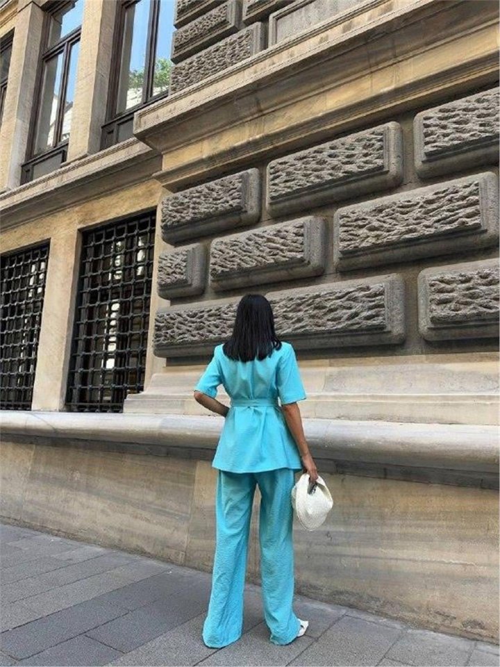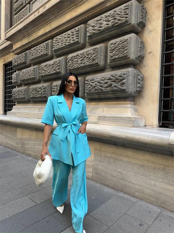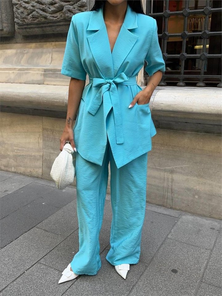 KISA KOL BAĞLAMA DETAYLI CEKET-PANTOLON TAKIM - Mavi
