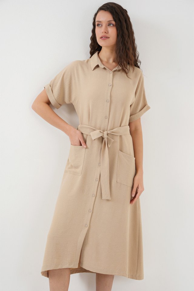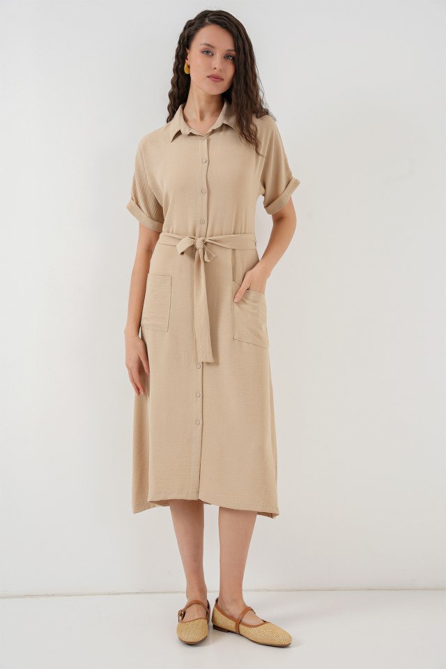Kadın Kısa Kollu Yakadan Ve Etekten Fermuarlı Midi Viskon Iki Iplik Elbise