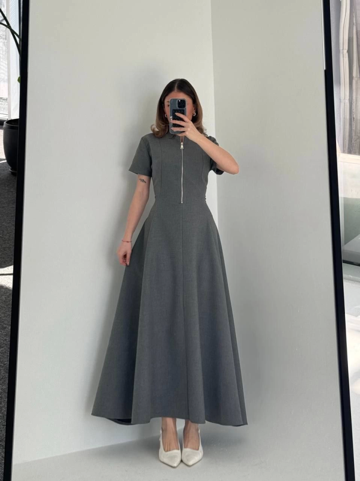 Kısa Kollu Önden Fermuarlı Çan Etekli Uzun Elbise - Antrasit