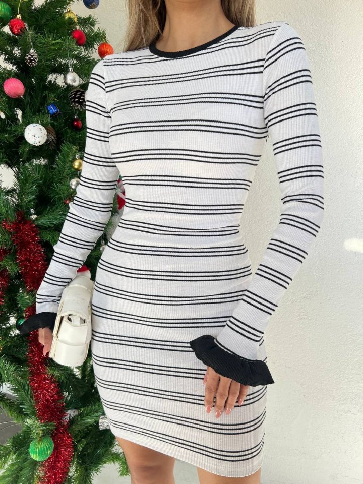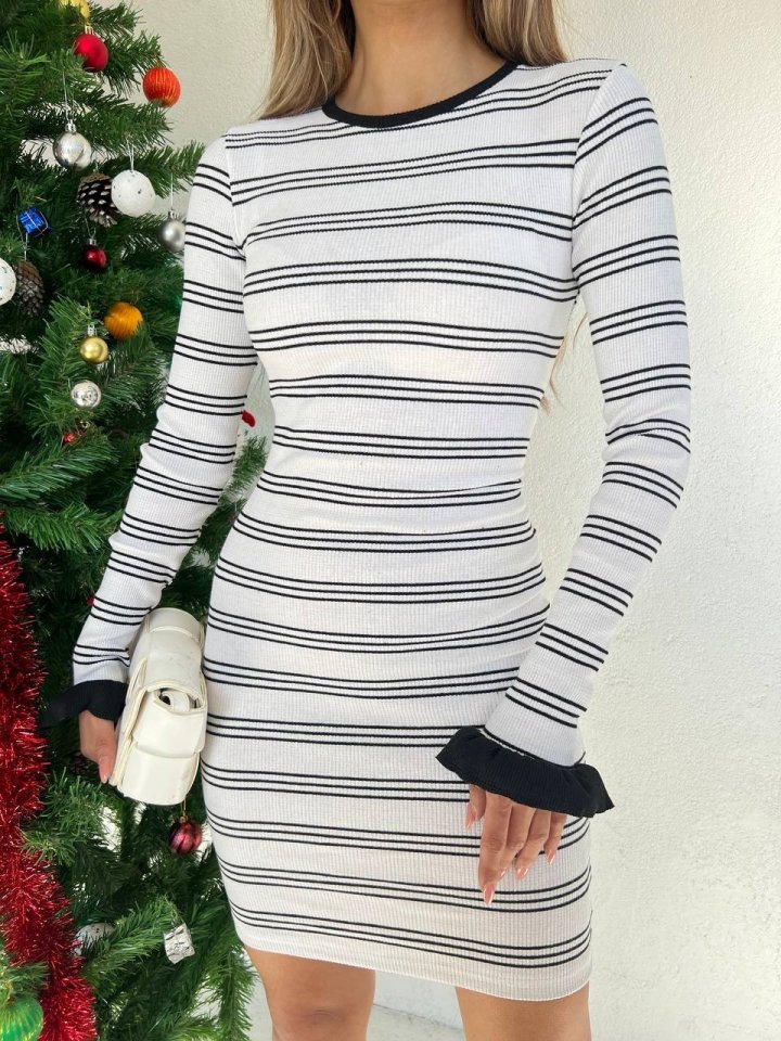 Kol Ucu Volan Çizgili Kaşkorse Elbise -Beyaz