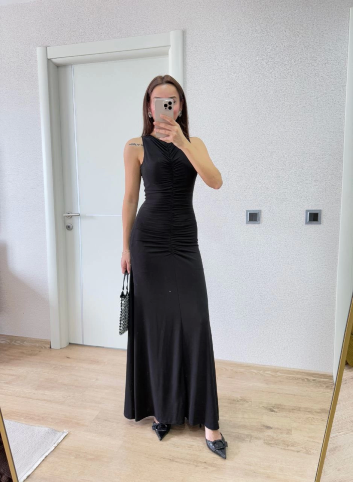 Kolsuz Büzgülü Uzun Elbise - Siyah