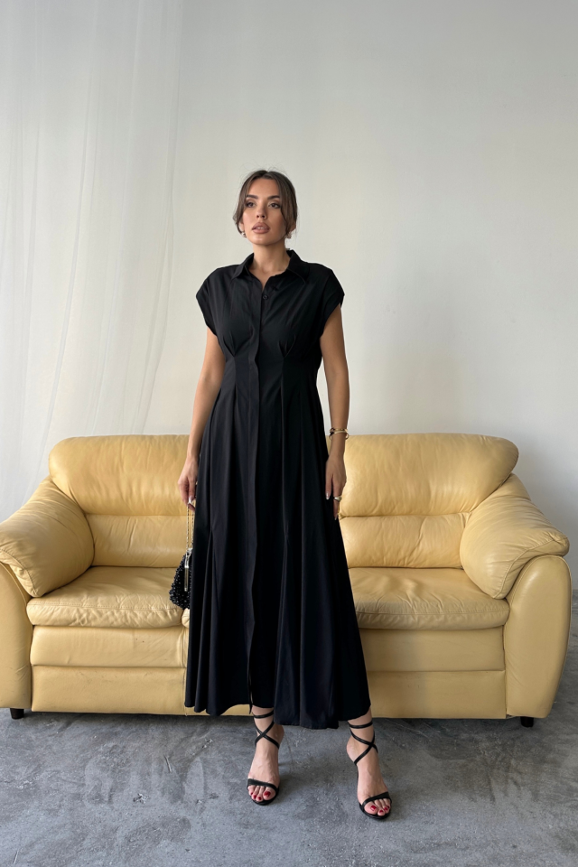 KOLSUZ VATKALI ÖNDEN DÜĞMELİBEL PENS DETAYLI POPLİN ELBİSE - Siyah