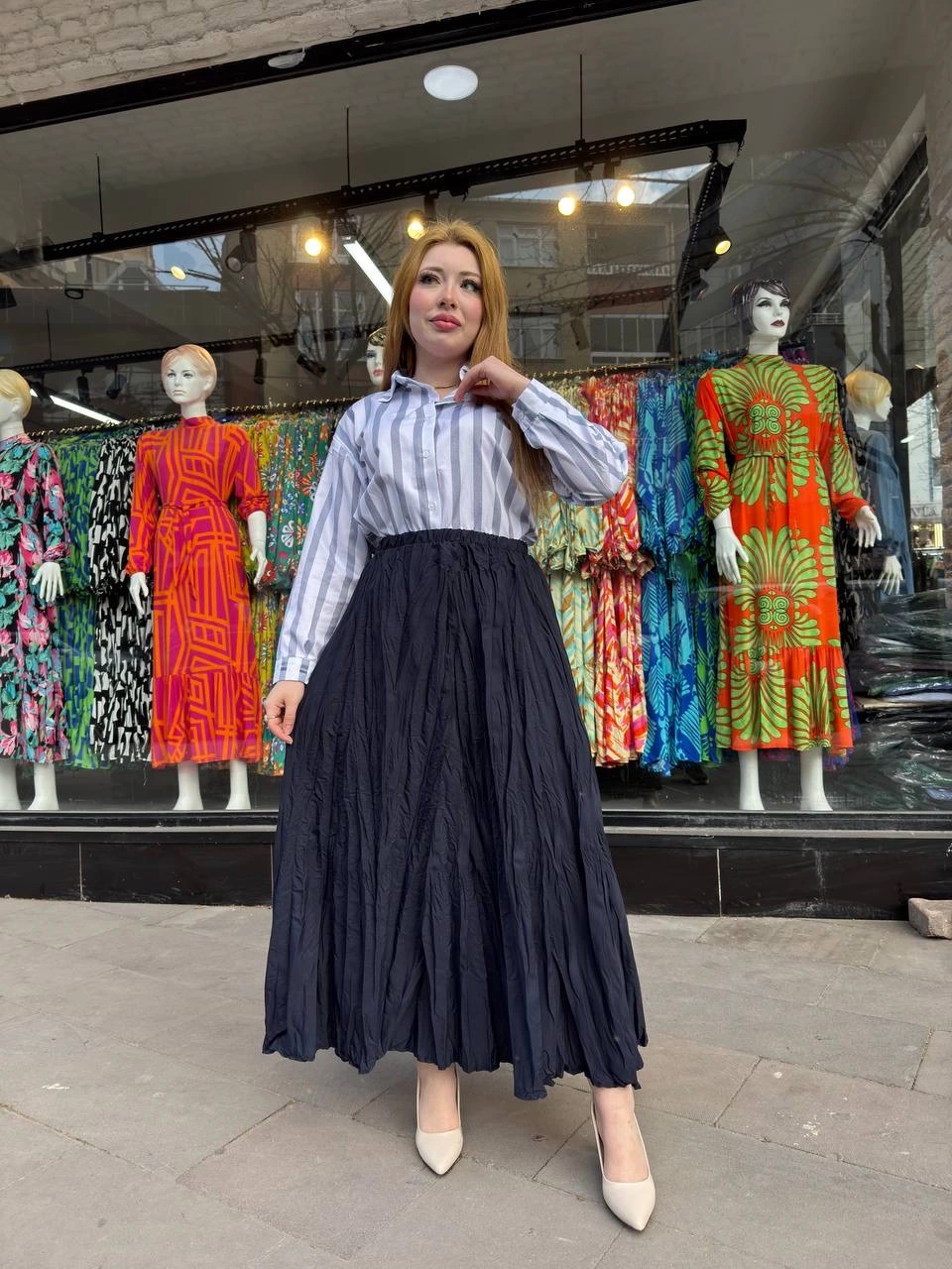 Kadın Uzun Kollu Yakadan Fermuarlı Kot Görünüm Desenli Uzun Modal Bluz