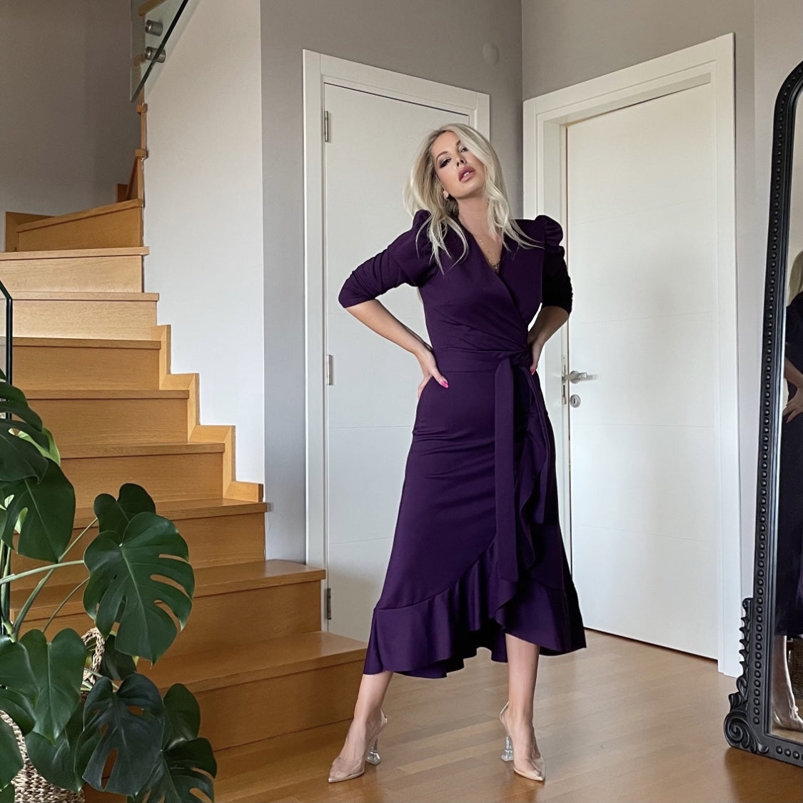 Kadın Uzun Kollu Kruvaze Yaka Büzgü Ve Balon Kol Detay Krep Kumaş Maxi Boy Elbise