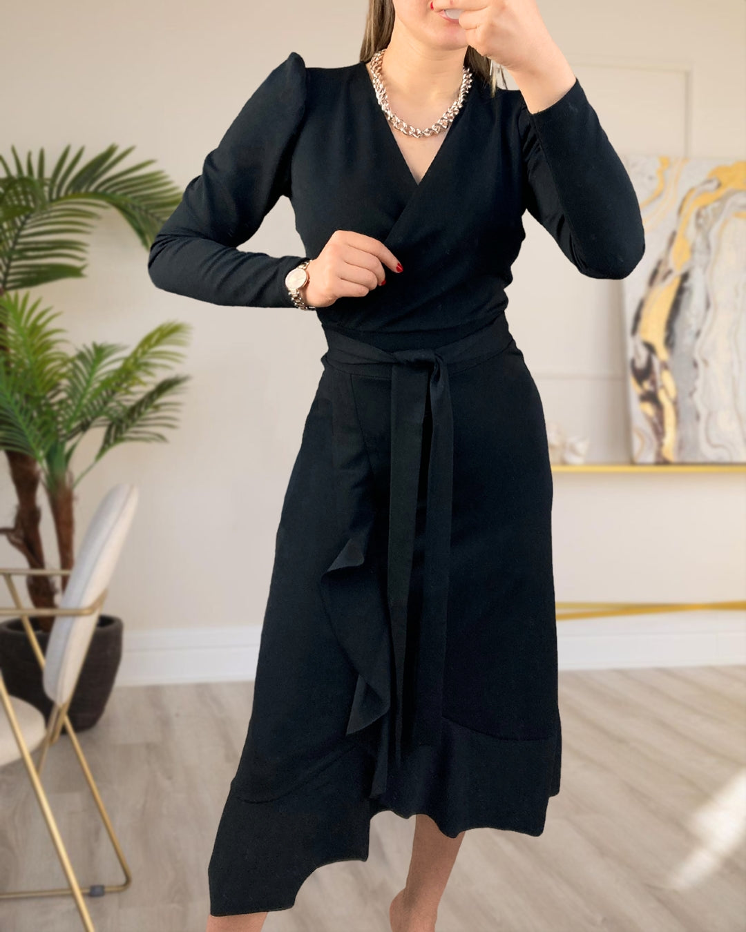 Kadın Uzun Kollu Kruvaze Yaka Büzgü Ve Balon Kol Detay Krep Kumaş Maxi Boy Elbise