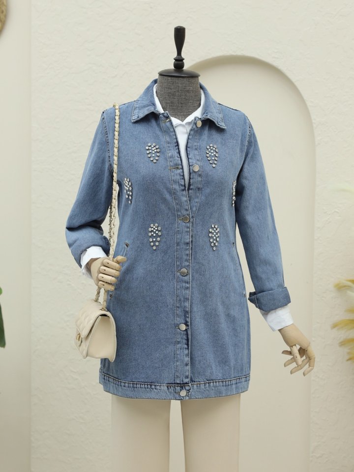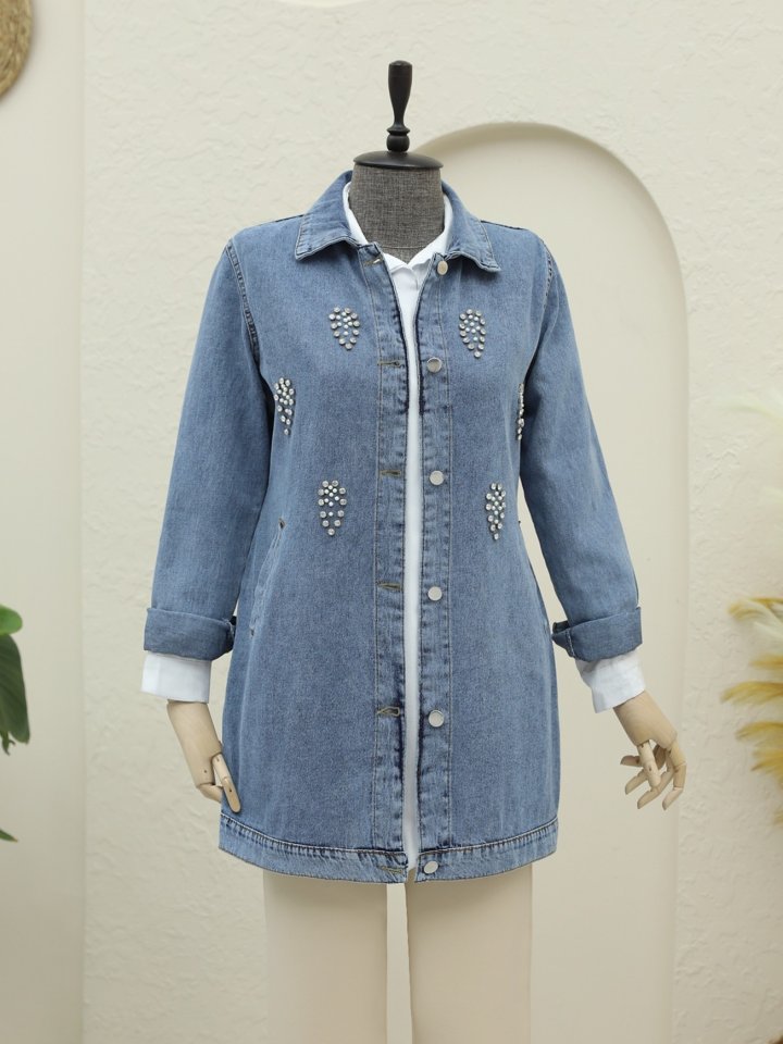 Küme Taş Detaylı Düğmeli Kot Ceket -Buz Mavi