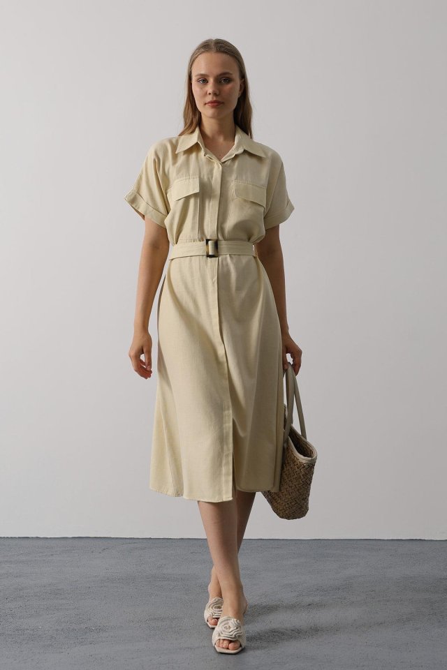 Kuşaklı Cep Detaylı Yarım Kol Elbise - Ekru