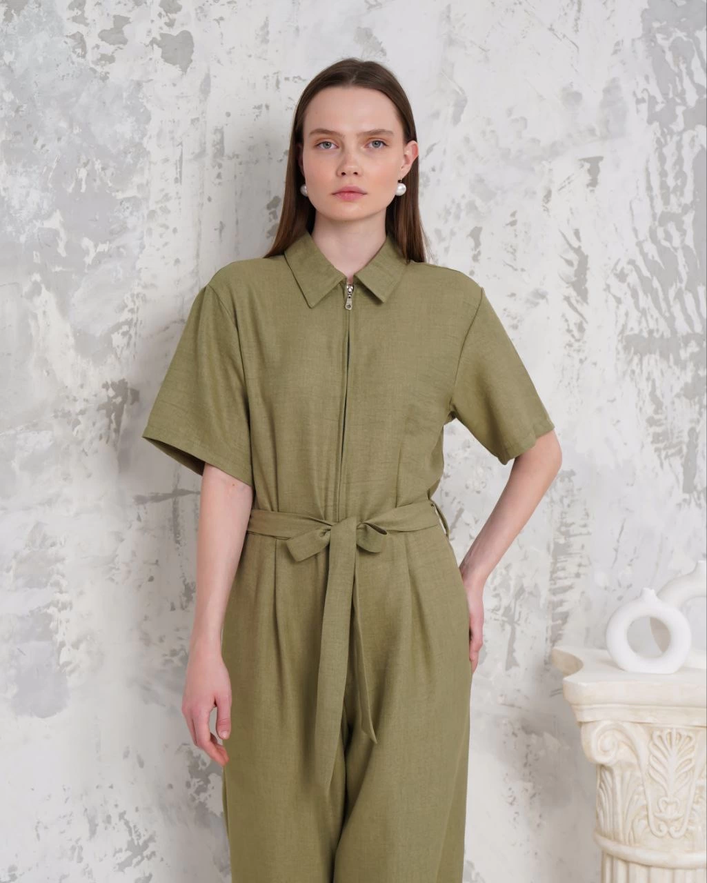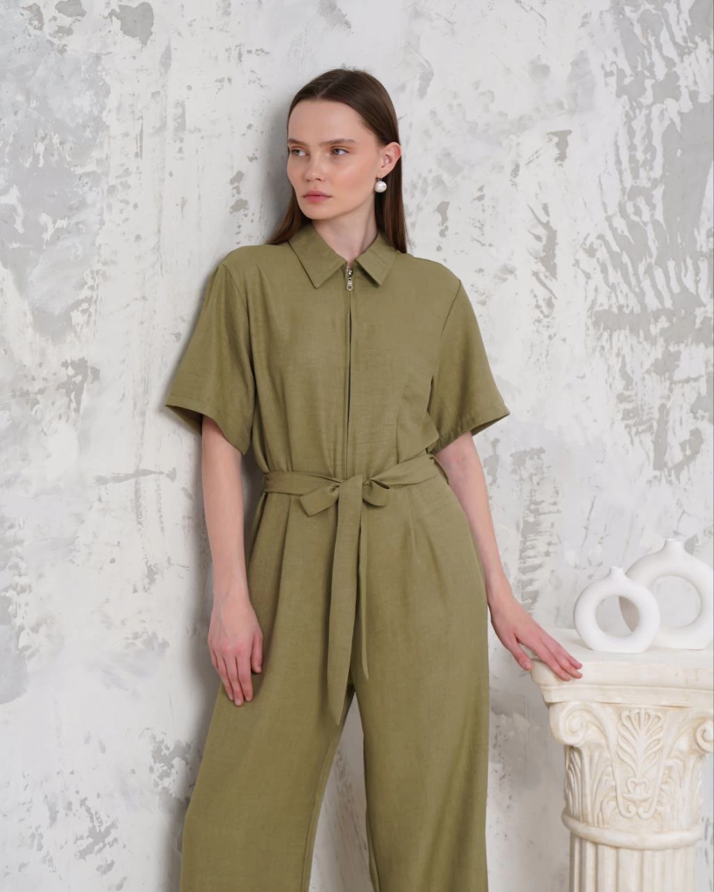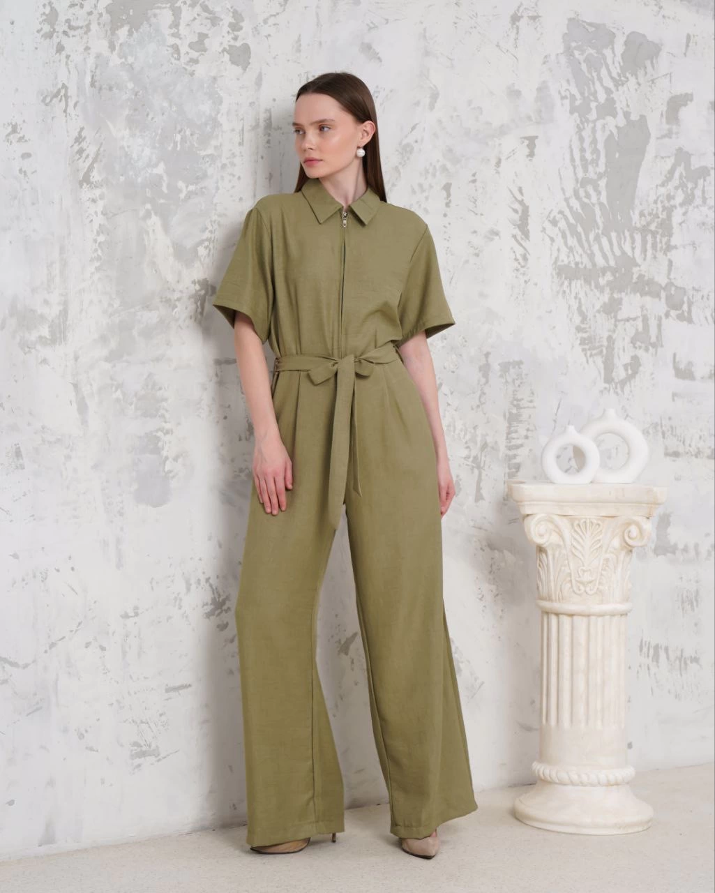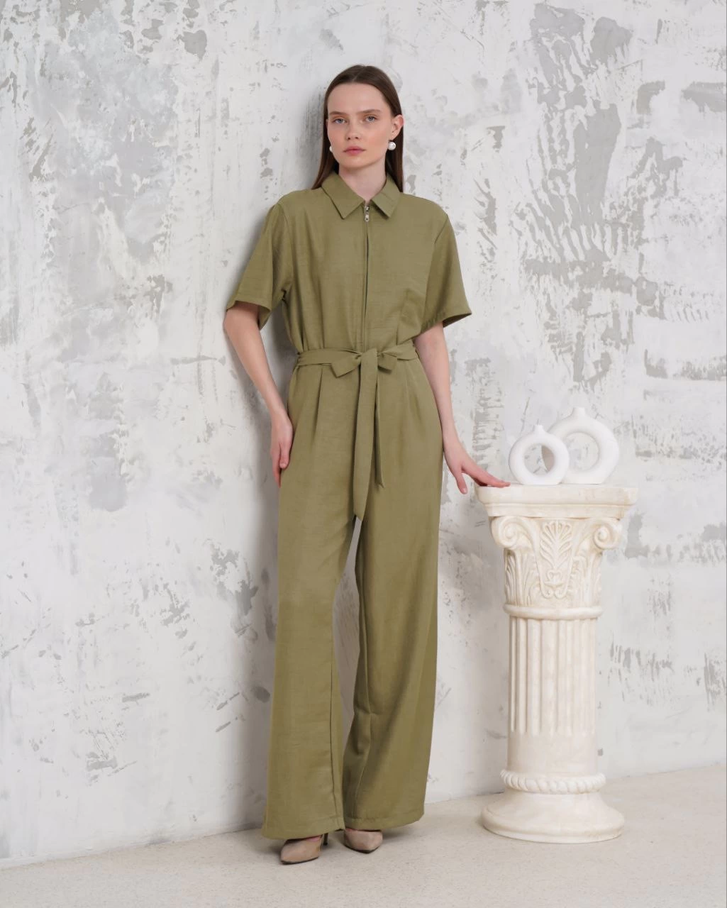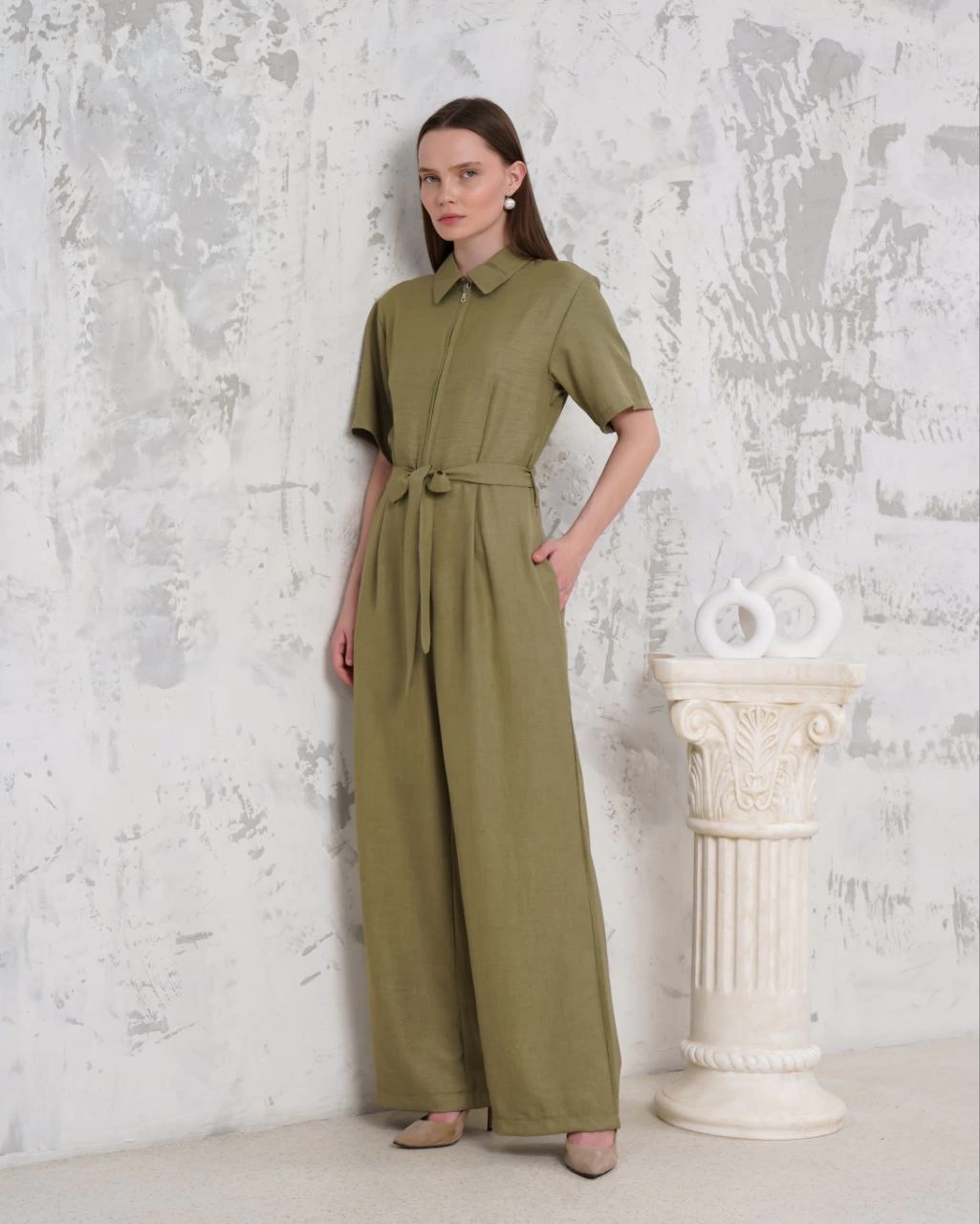 Kuşaklı gömlek yaka salaş tulum haki s255822