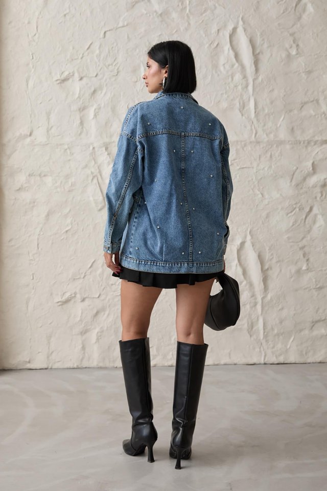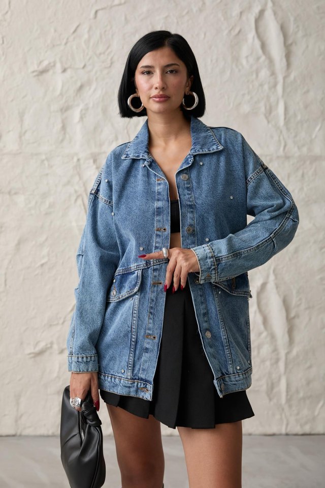 Kadın Uzun Kollu Yakadan Fermuarlı Kot Görünüm Desenli Uzun Modal Bluz
