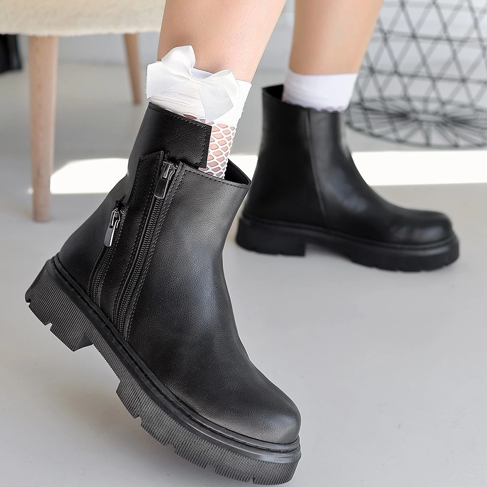 Menta Siyah Cilt Fermuar Aksesuarlı Bot