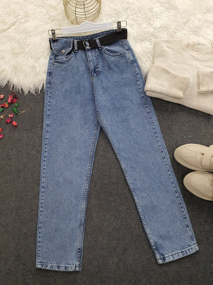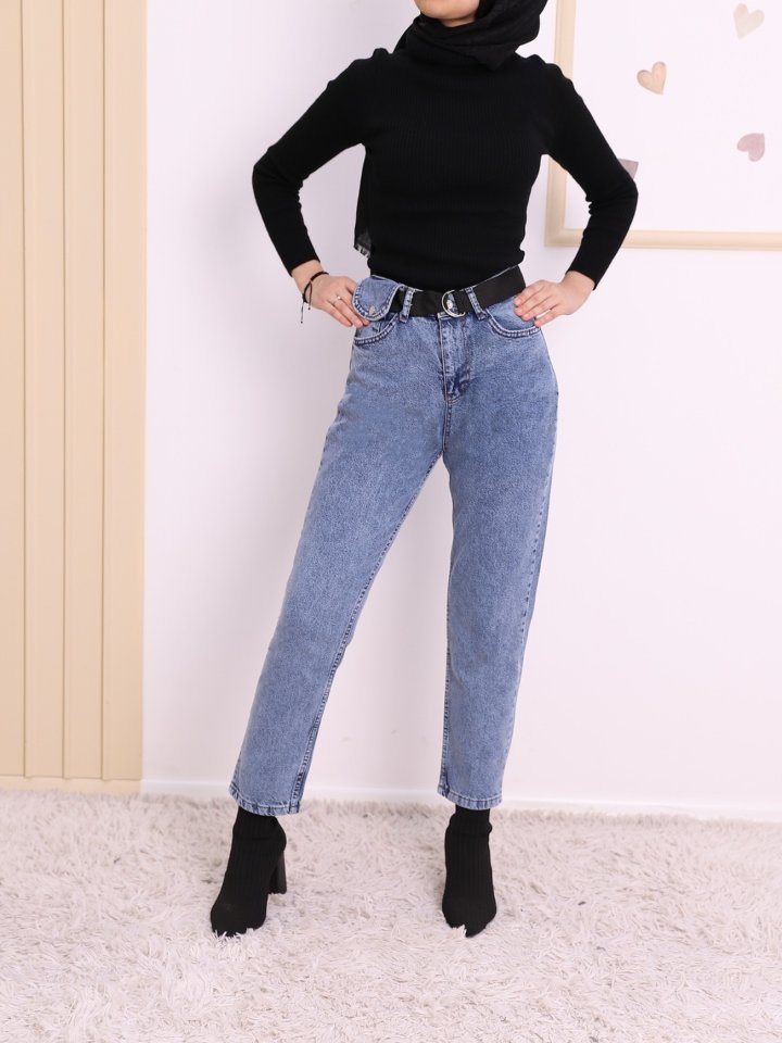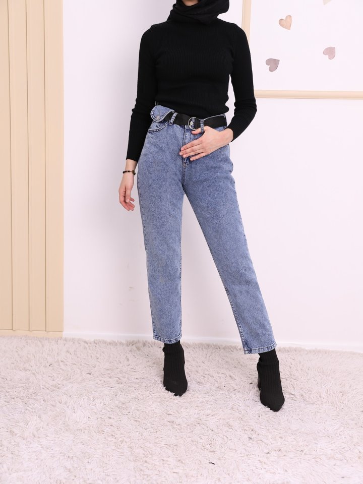 Metal Tokalı Kemerli Çıt Çıt Detaylı Kot Pantolon -Koyu Mavi