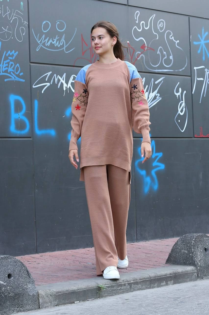 Omuz detaylı kol nakışlı ikili alt üst triko takım vizon