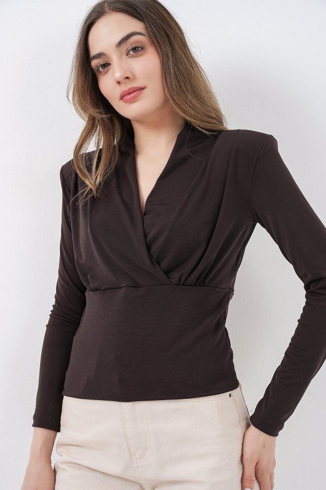 Omuz Vatkalı Kruvaze Yaka Bluz 942 - Kahverengi