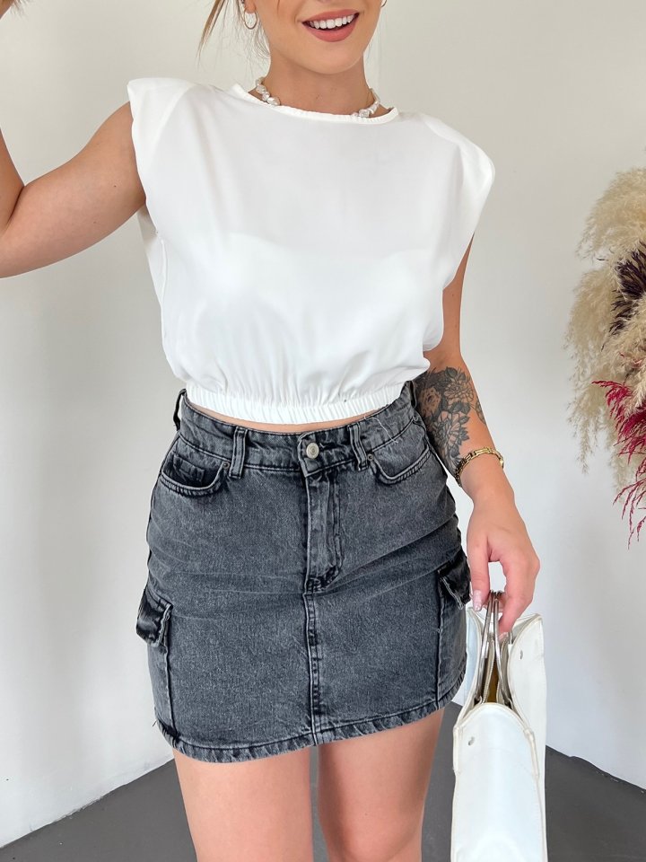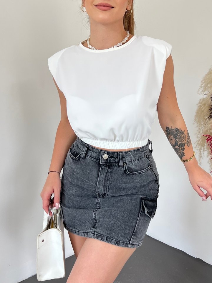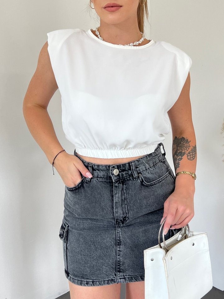 Omuzları Vatkalı Beli Lastikli Bluz -Beyaz