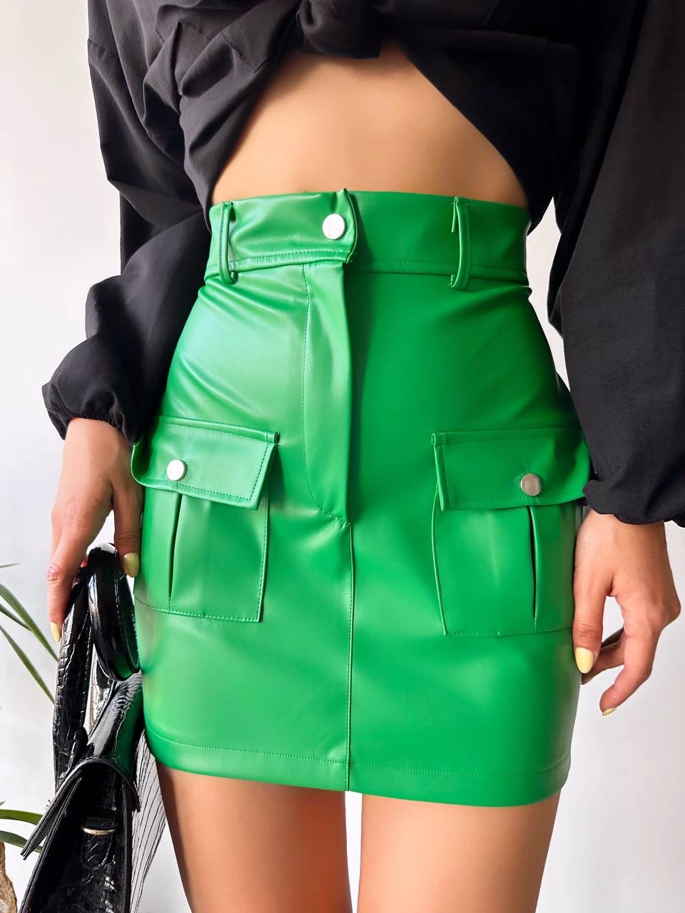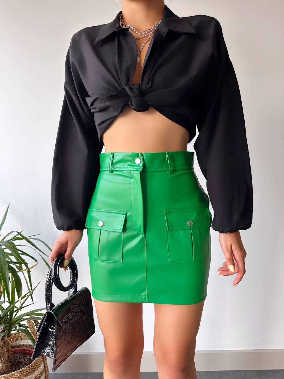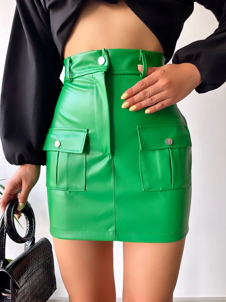 Önden iki cepli deri etek yeşil h240040