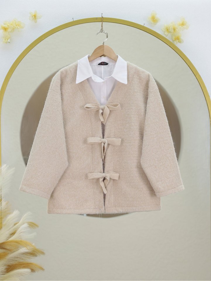 Önü Bağlamalı Kırçıllı Kaşe Ceket -Bej