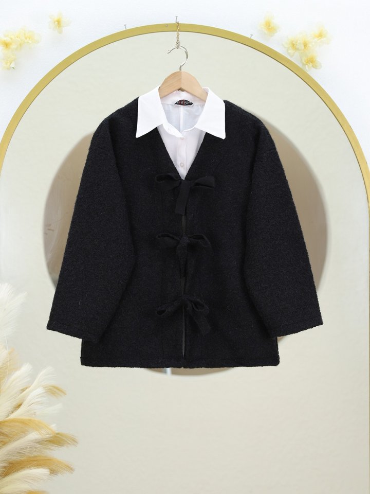 Önü Bağlamalı Kırçıllı Kaşe Ceket -Siyah