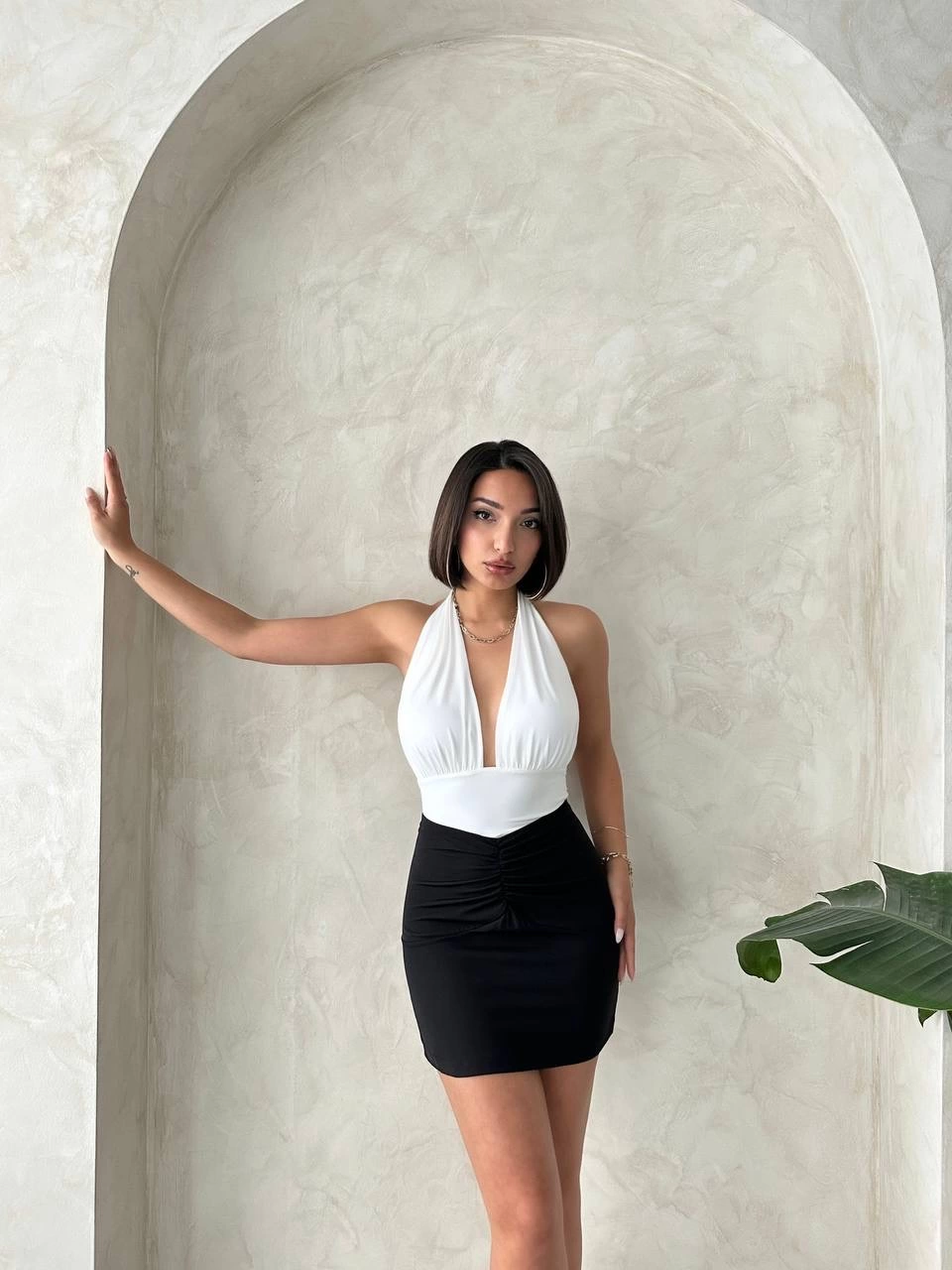 Kadın Kolsuz Boyundan çapraz Geçirmeli Göğüs Damla Detay Kaşkorse Bluz