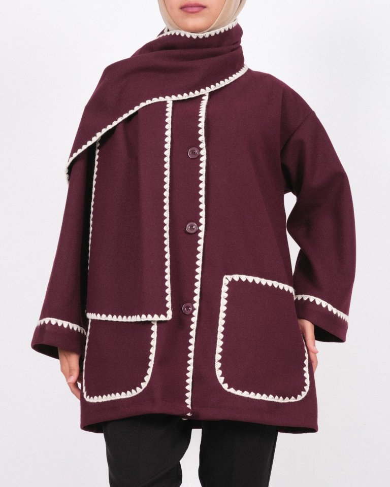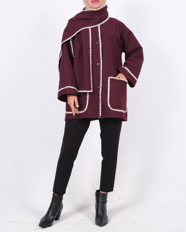 Önü Düğmeli Atkılı Cepli Ceket -Bordo