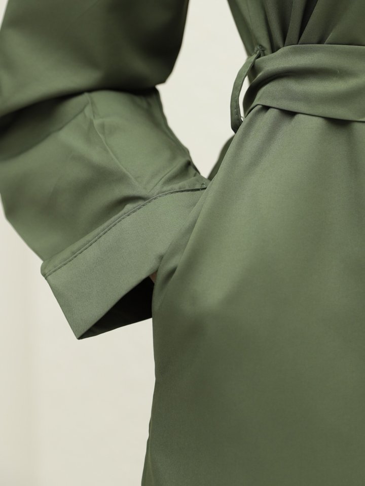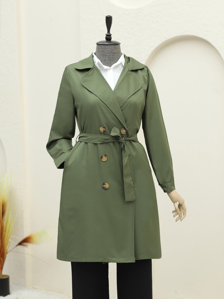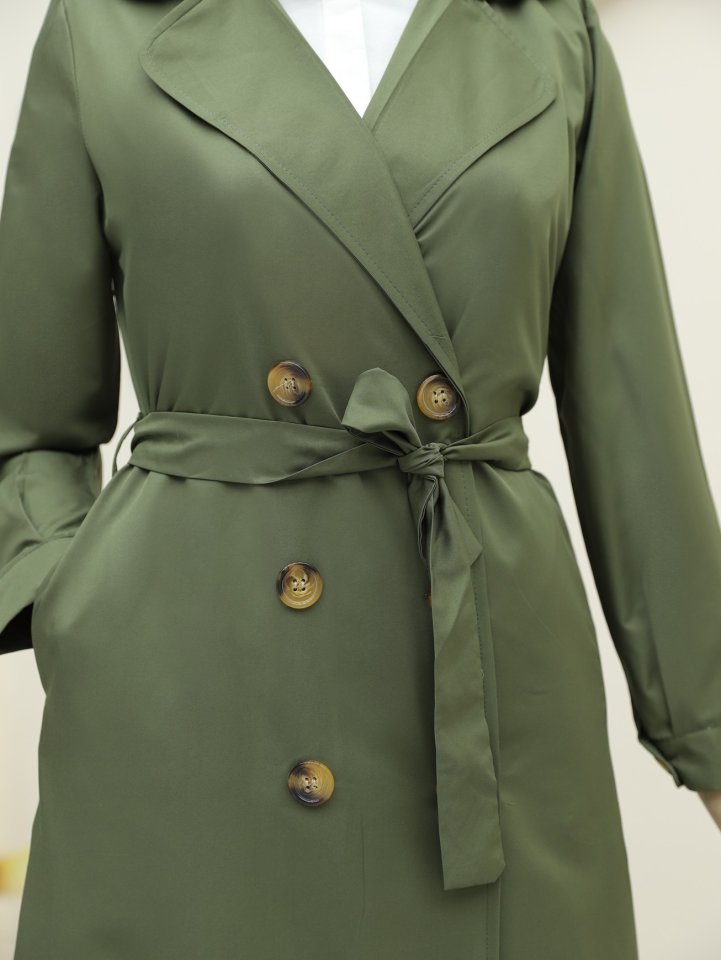 Önü Düğmeli Kuşaklı Cepli Trençkot -Haki