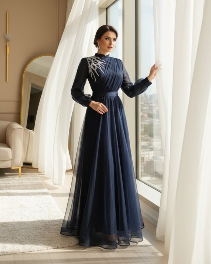 Önü Taş Detaylı Drapeli Kemerli Tül Abiye -Laci