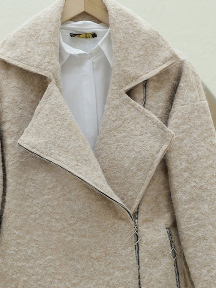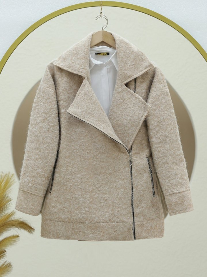Önü Ve Cebi Fermuarlı Astarlı Buklet Ceket -Bej