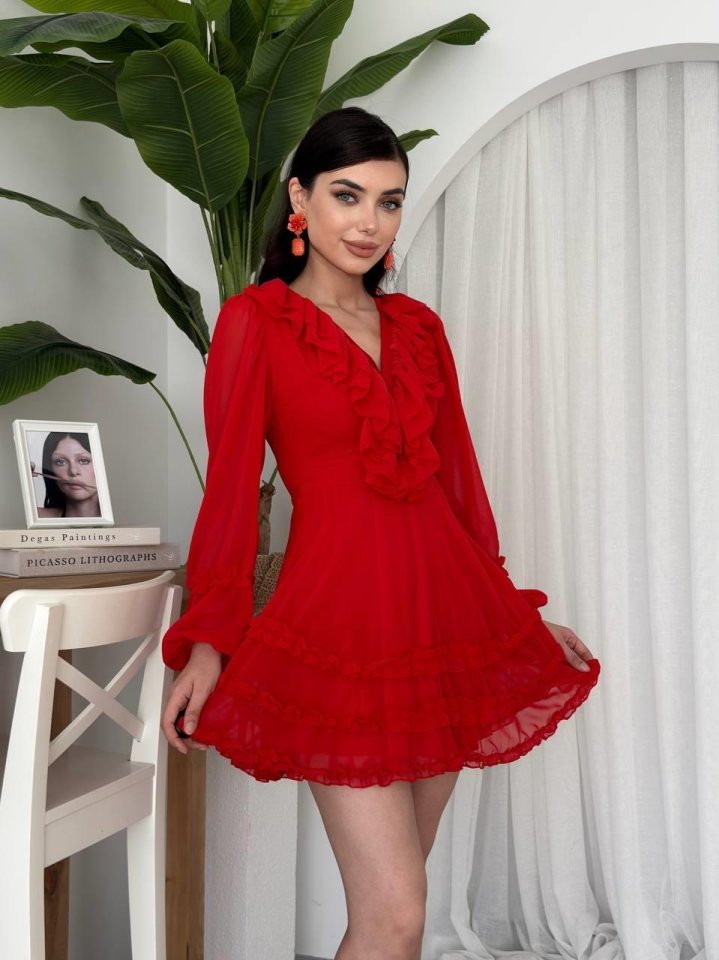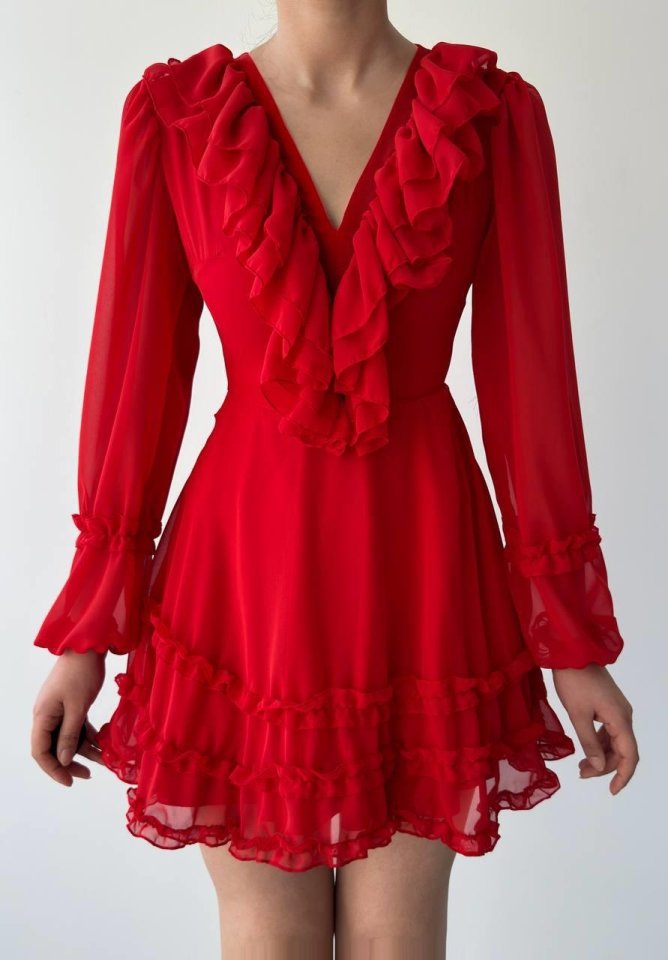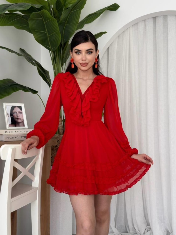 Kadın Kısa Kollu Yakası Açık Katlı Bürümcük Balon Elbise