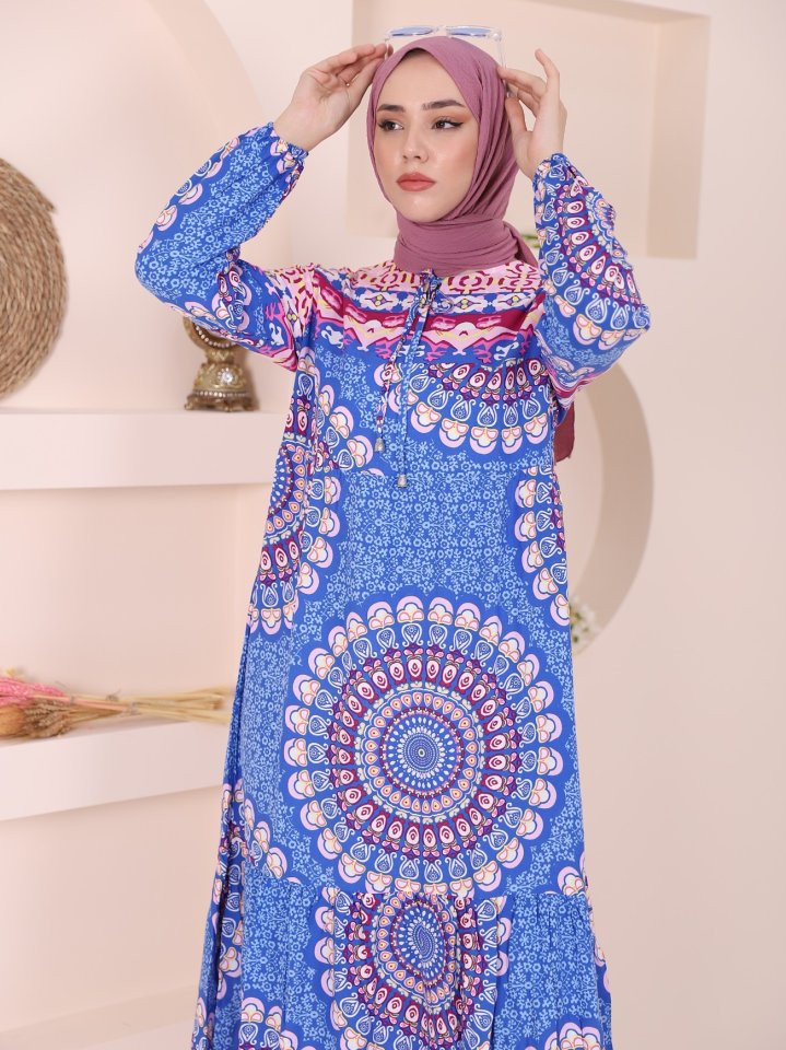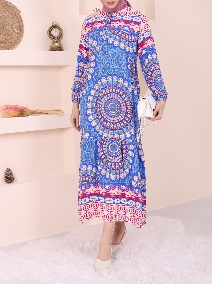 Parçalı Deseli Bağcıklı Kolu Lastikli Elbise -Mavi