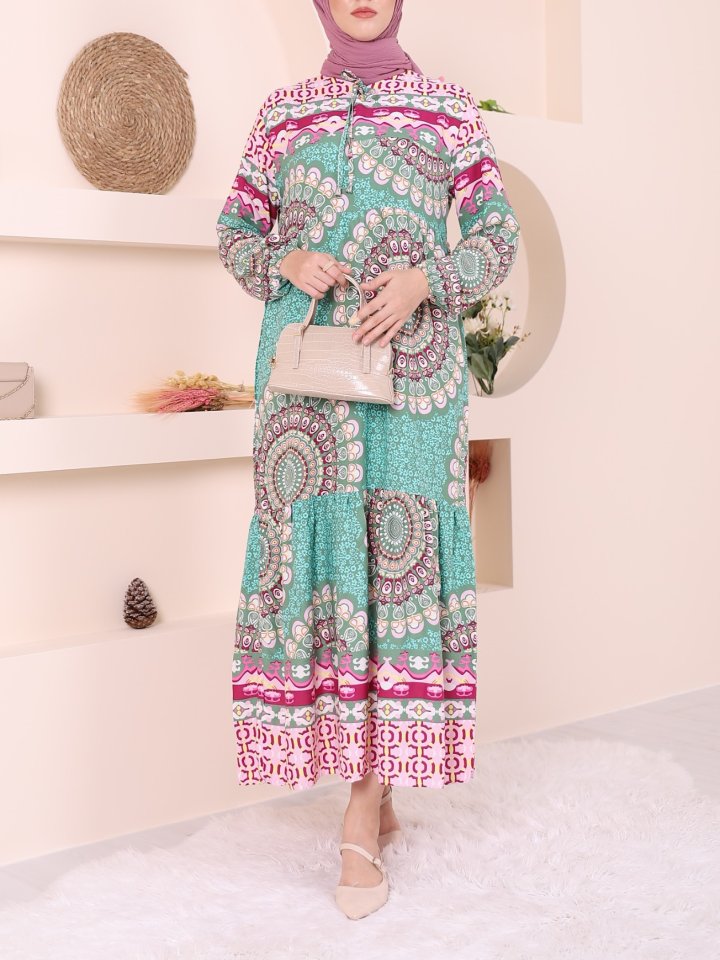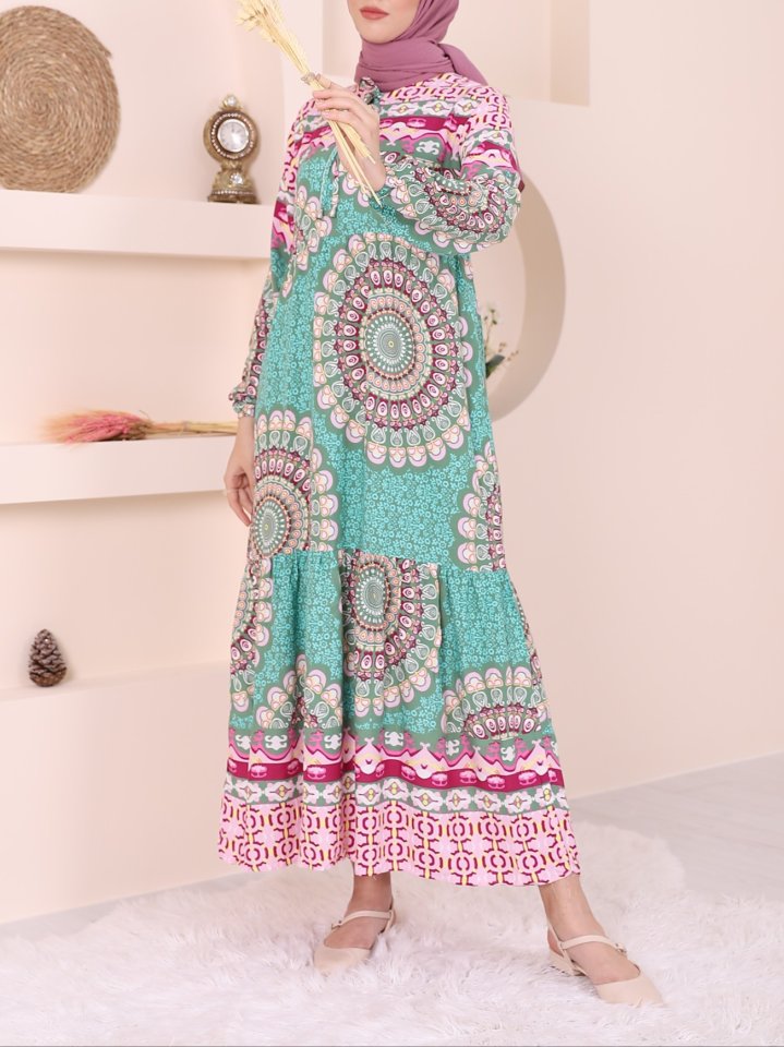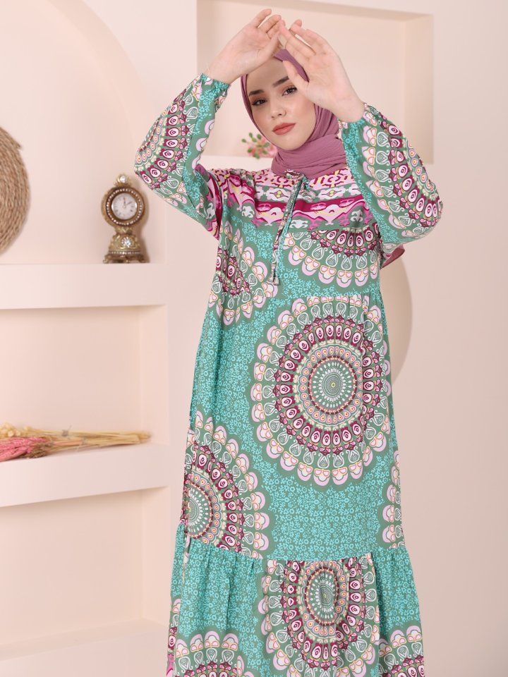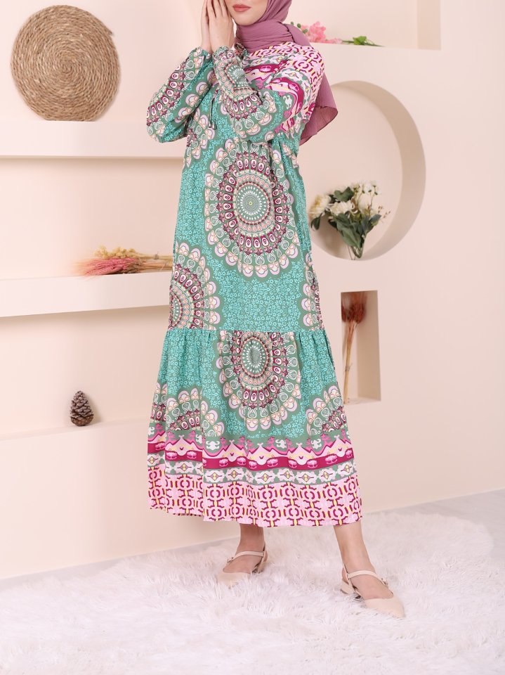 Parçalı Deseli Bağcıklı Kolu Lastikli Elbise -Yeşil