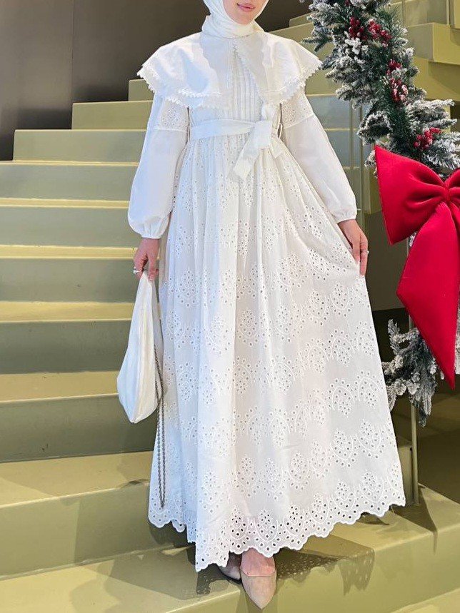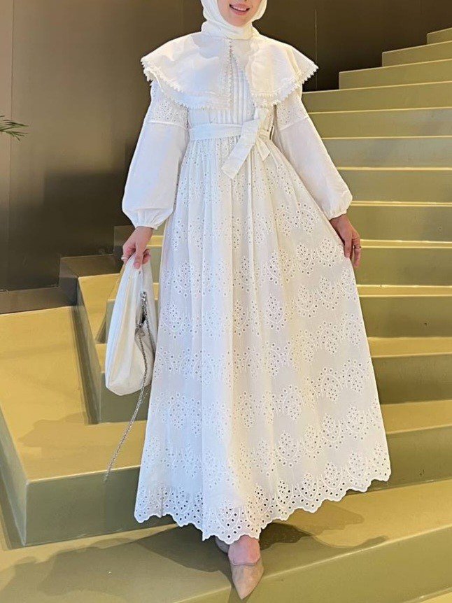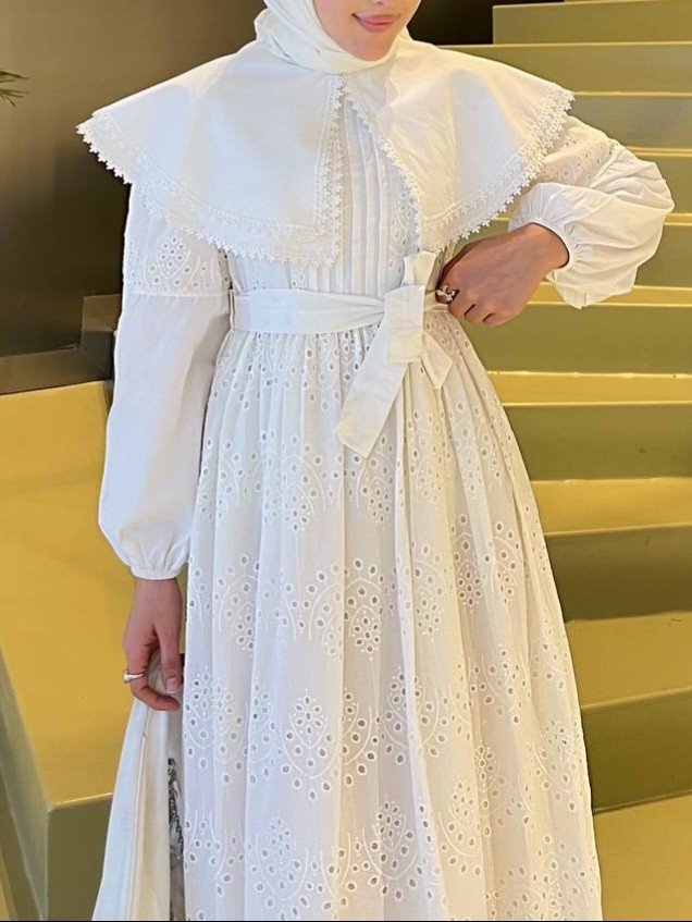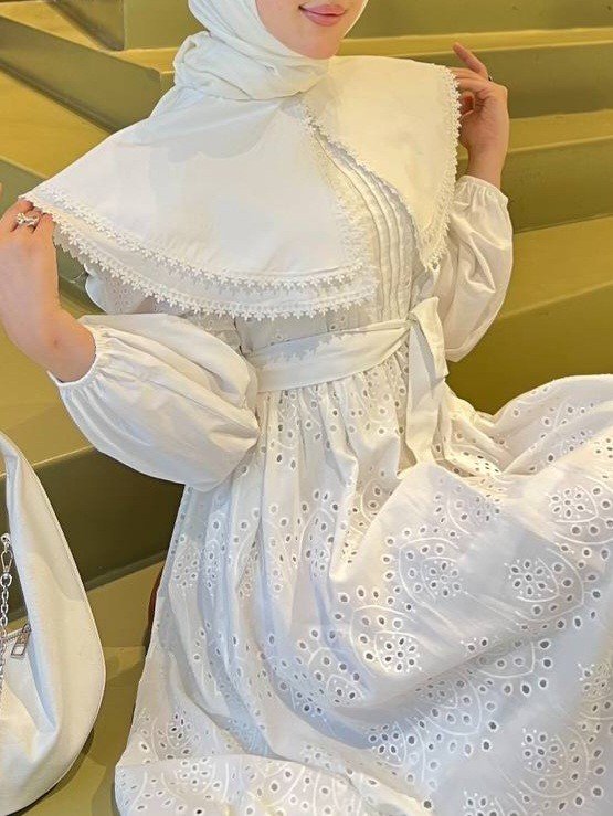 Pelerin Yaka Dantel Detaylı Elbise -Beyaz