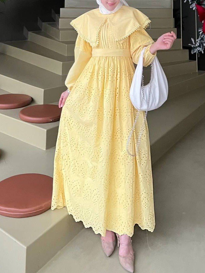 Pelerin Yaka Dantel Detaylı Elbise -Sarı