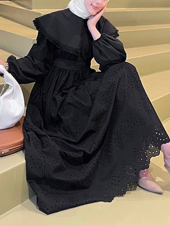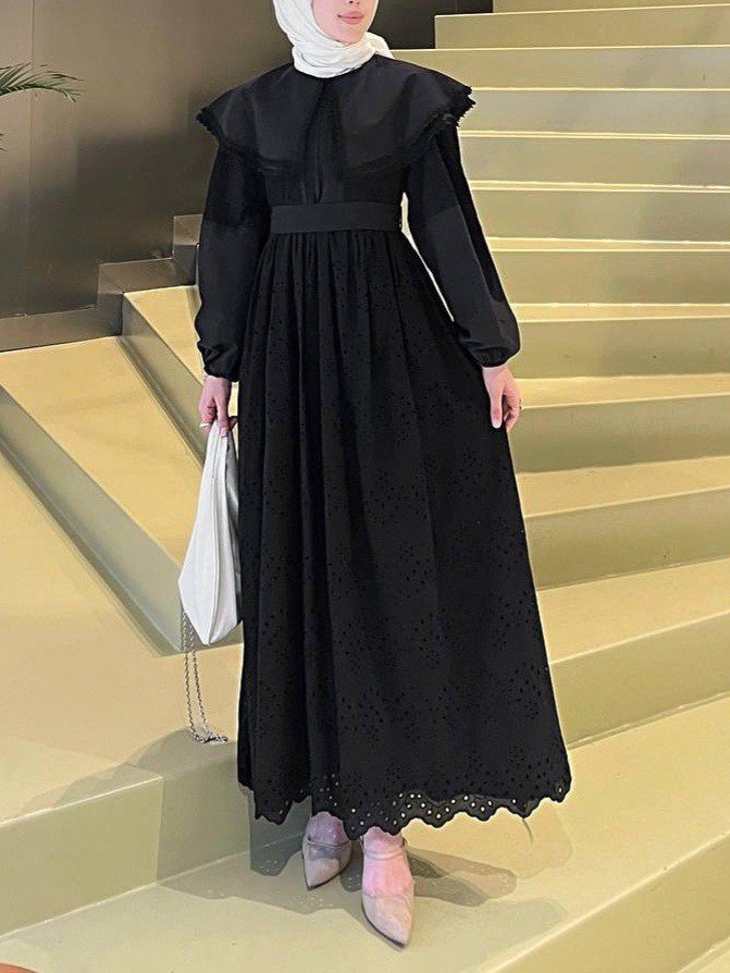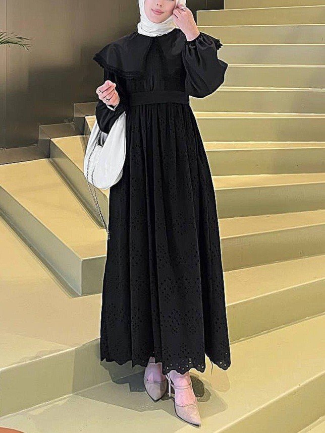 Pelerin Yaka Dantel Detaylı Elbise -Siyah