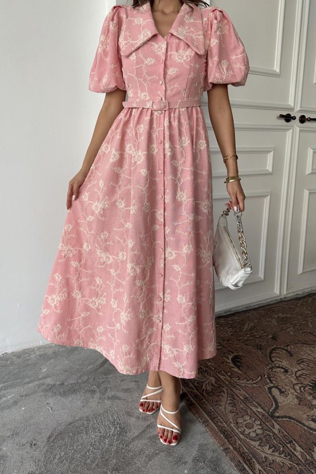 Kadın Kısa Kollu Yakası Açık Katlı Bürümcük Balon Elbise