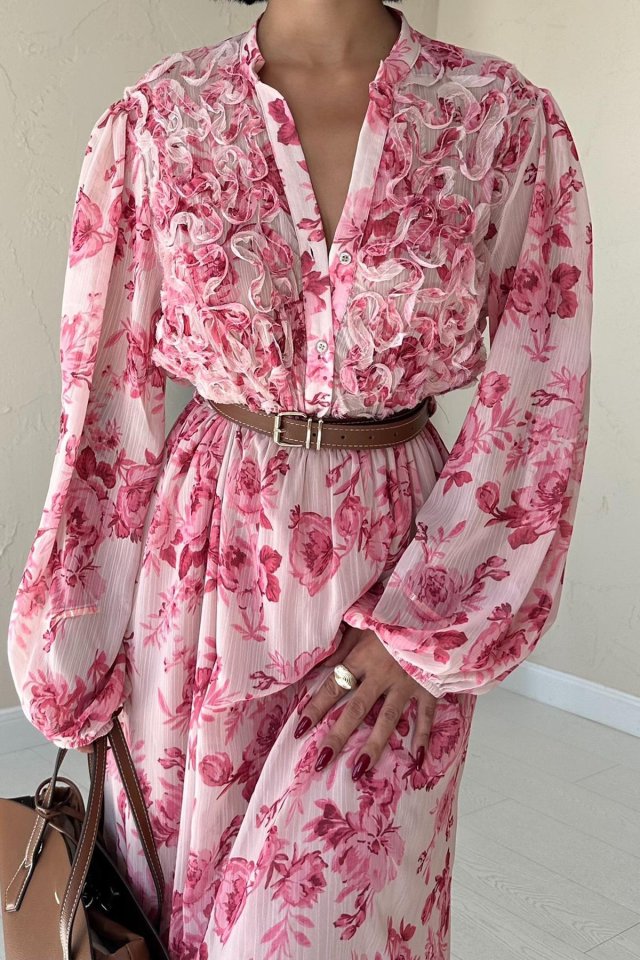 Kadın Uzun Kollu Kruvaze Yaka Büzgü Ve Balon Kol Detay Krep Kumaş Maxi Boy Elbise