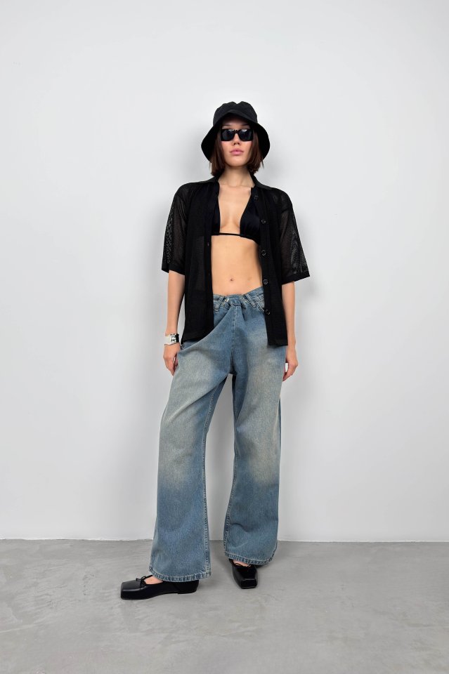 Kadın Uzun Kollu Yakadan Fermuarlı Kot Görünüm Desenli Uzun Modal Bluz